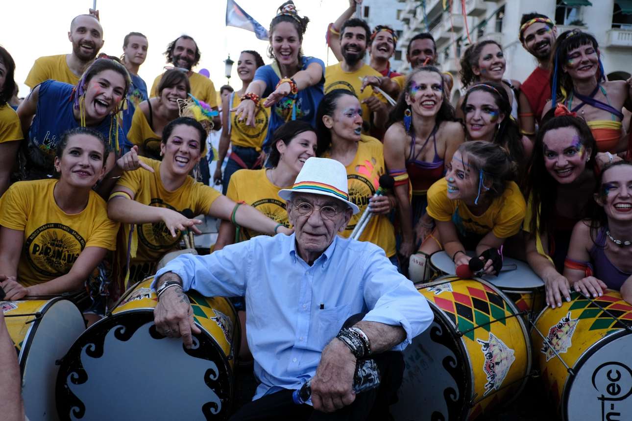22 Ιουνίου. Ο δήμαρχος Θεσσαλονίκης Γιάννης Μπουτάρης ποζάρει με μια μπάντα του Thessaloniki Pride στην παρέλαση της υπερηφάνειας και της διαφορετικότητας