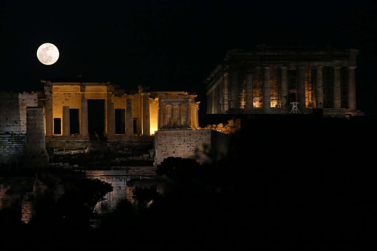 20 Φεβρουαρίου. Η υπερπανσέληνος παίρνει τη θέση της πάνω από τα Προπύλαια στην Ακρόπολη