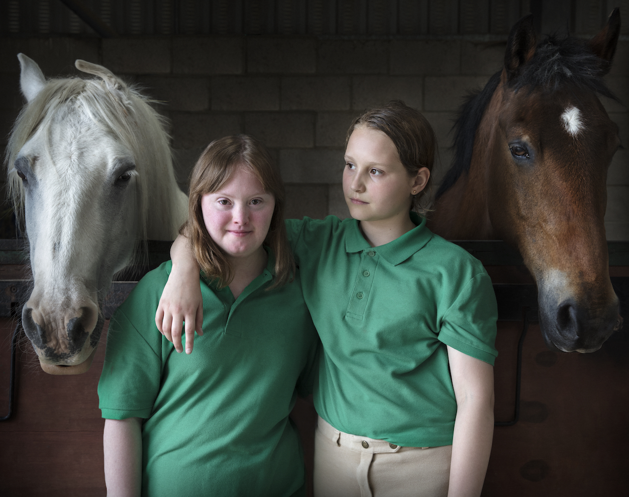 Οι αδελφές Χάτι και Σάρλοτ ποζάρουν αγκαλιασμένες δίπλα στα άλογά τους, το 2017. Από το τρέχον πρότζεκτ «Η Ανθρώπινη Κατάστασή μας»