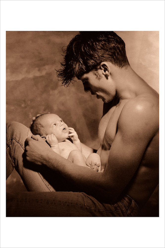 Η φωτογραφία του 1986 που έμελλε να γίνει η πιο ευπώλητη αφίσα στη Βρετανία με το μοντέλο Ανταμ Πέρι να κρατάει στην αγκαλιά του των δύο εβδομάδων Στέλιο. Η εμβληματική αφίσα σηματοδότησε την άφιξη του ευαίσθητου αλλά και σέξι «Νέου Ανδρα»