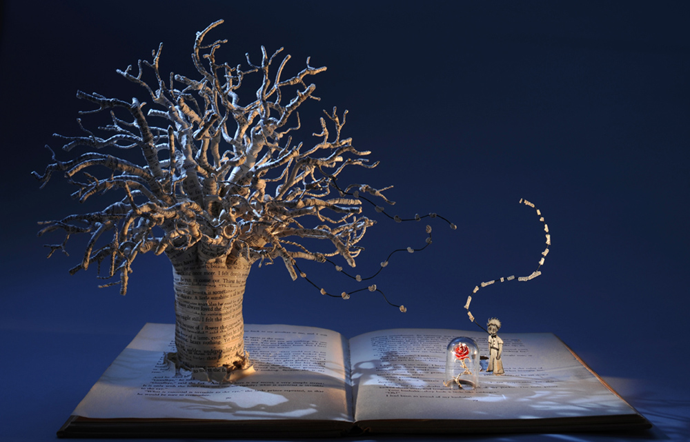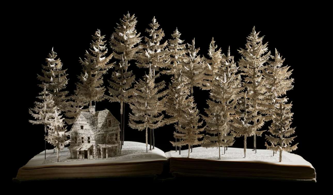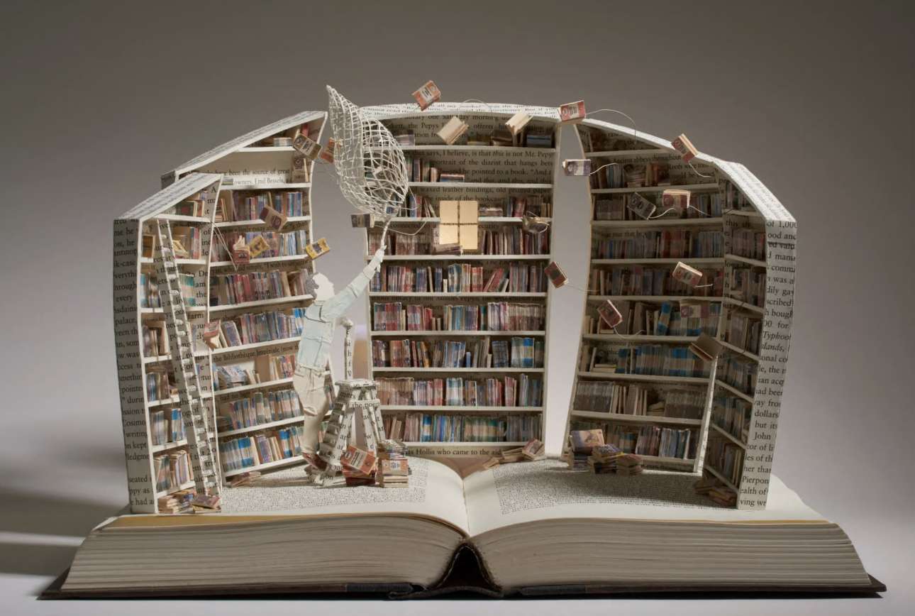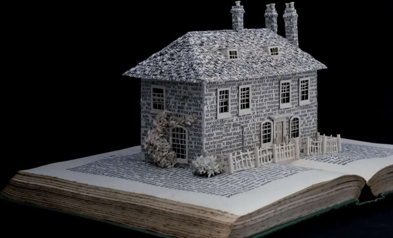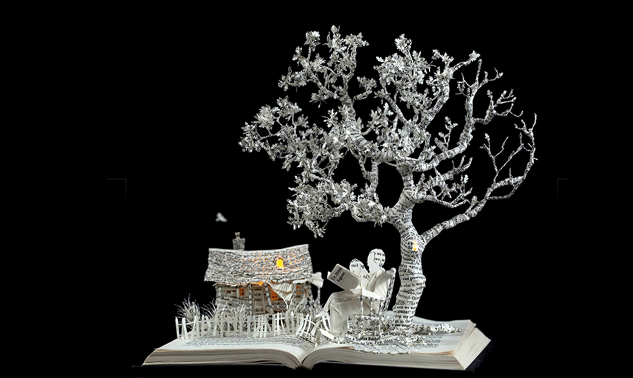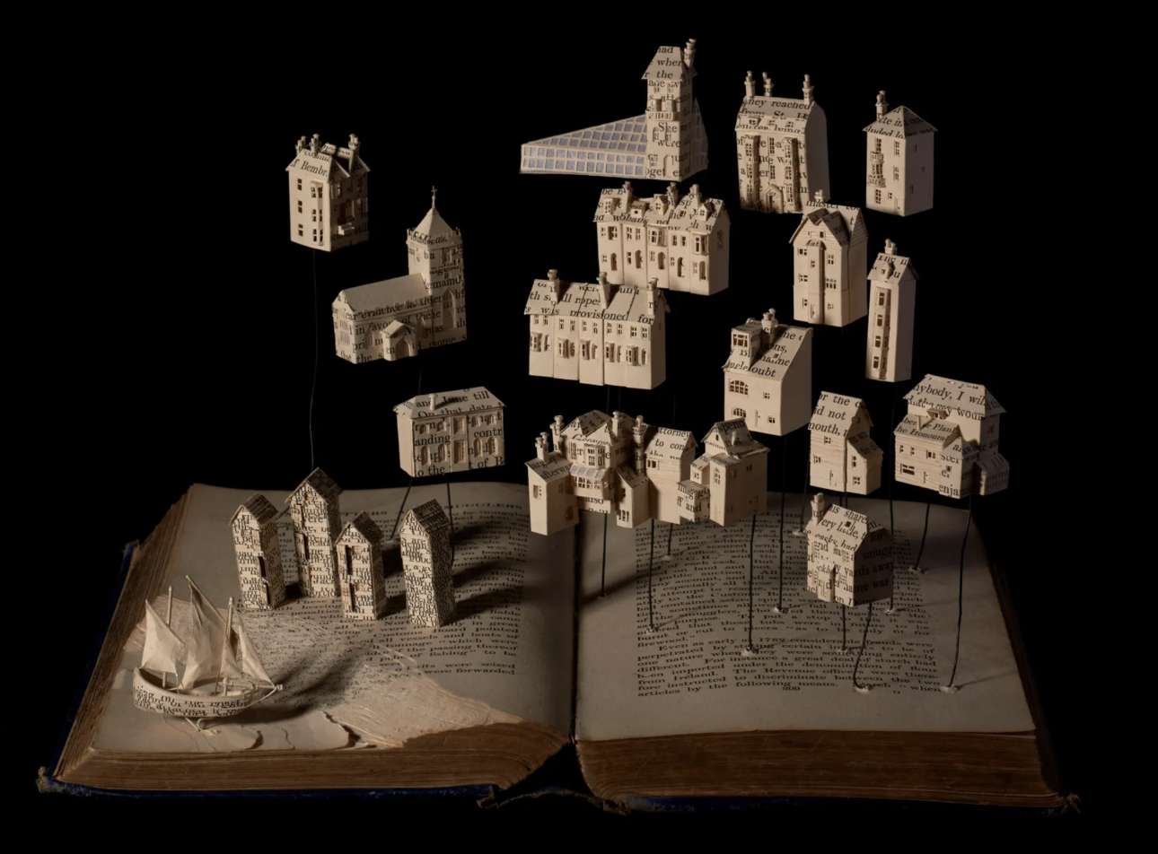 Η βρετανίδα Σου Μπλάκγουελ χρησιμοποιούσε πάντα κείμενο στην τέχνη της, αλλά άρχισε να δημιουργεί γλυπτά από βιβλία όταν πέθανε ο πατέρας της: μέσα στο πένθος της, άρχισε να δημιουργεί πεταλούδες από χαρτί πάνω από τις σελίδες του «Ησυχου Αμερικανού», του διάσημο μυθιστορήματος του Γκράχαμ Γκριν, το οποίο είχε βρει σε ένα βιβλιοπωλείο μεταχειρισμένων στην Ταϊλάνδη. Από τότε, αγοράζει μεταχειρισμένα βιβλία και κατασκευάζει εκπληκτικά διοράματα με σπίτια, χαρακτήρες παραμυθιών, ζώα και φυτά, καλώντας μας να αναλογιστούμε την ευθραυστότητα της ζωής, των ονείρων και των φιλοδοξιών μας