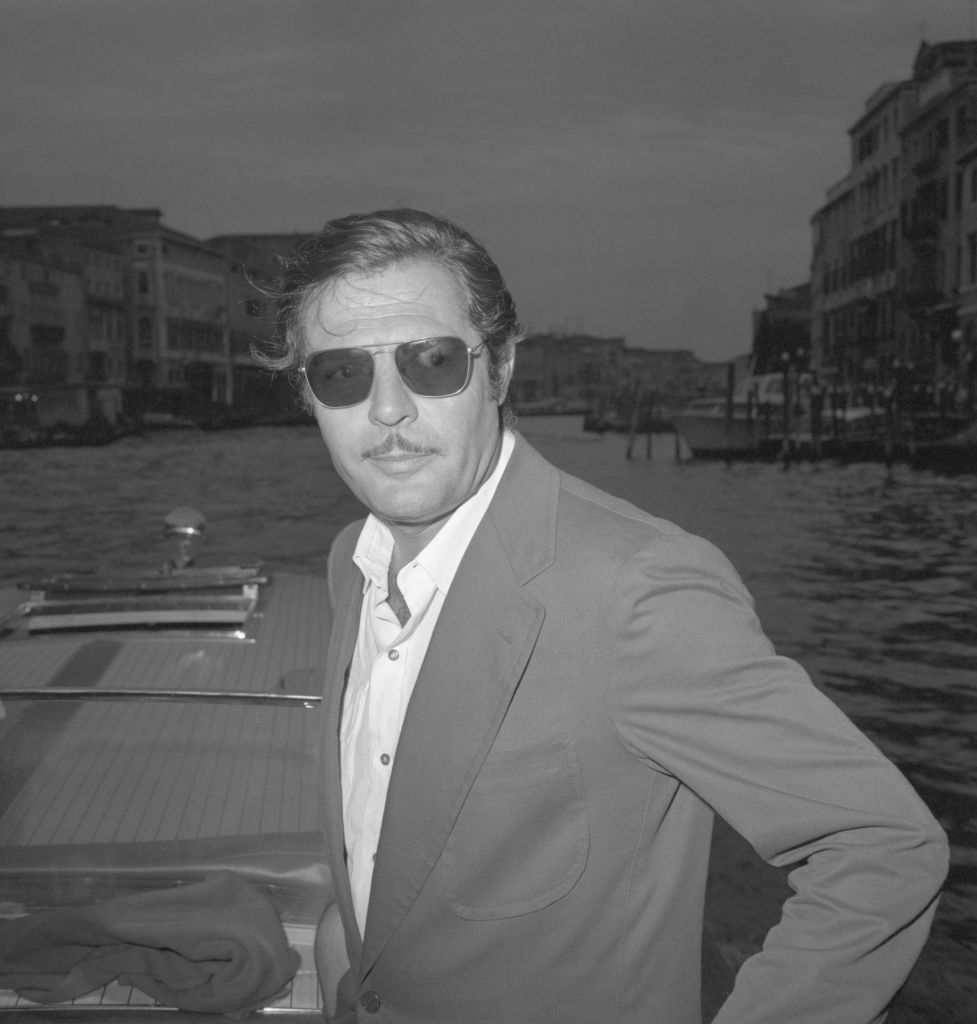 Ο Μαρτσέλο Μαστρογιάννι, φορώντας σακάκι και γυαλιά ηλίου, κάνει βόλτες στο Μεγάλο Κανάλι της Βενετίας, 50 χρόνια πριν