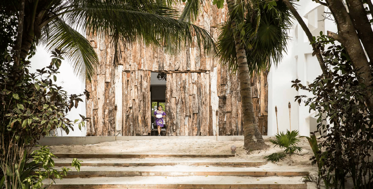 Αυτή είναι η είσοδος της Casa Malca. Καμουφλαρισμένη με κορμούς δέντρων. Προσέξτε την άμμο στα σκαλοπάτια... Την πατάς, τρυπώνει στο παπούτσι κι εσύ βουτάς σε κλίμα διακοπών προτού καν μπεις μέσα στον χώρο του ξενοδοχείου