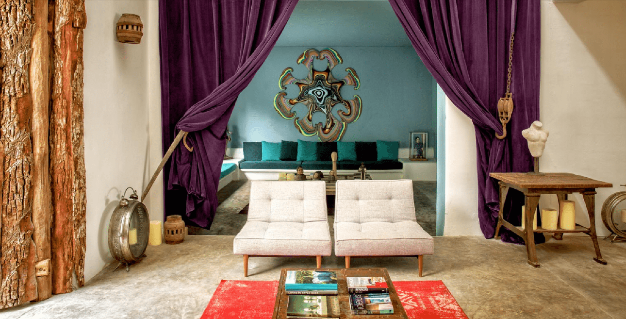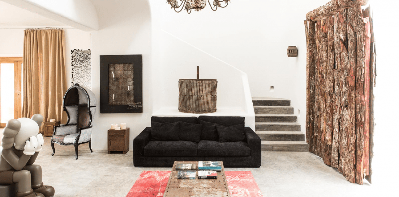 Ενα από τα δωμάτια της έπαυλης. Με έπιπλα μεξικάνικου στιλ, με έργα τέχνης, με μοντέρνο αέρα. Οι τιμές των δωματίων αρχίζουν από €450 τη βραδιά