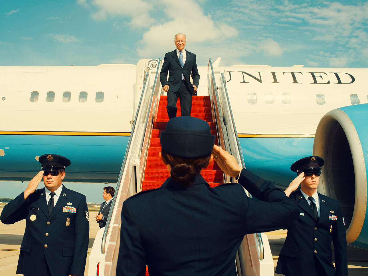 Ο Τζο Μπάιντεν χαμογελαστός κατά την αποβίβασή του μετά το πρώτο του προεδρικό ταξίδι με το Air Force One. Φεβρουάριος 2021