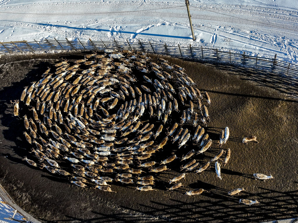 Τάρανδοι μαζεμένοι σε μαντρί στην περιοχή Λοβοζέρο της Ρωσίας κατά τη διάρκεια ανοιξιάτικης απογραφής. Οι τάρανδοι εμβολιάστηκαν, έλαβαν φροντίδα για τα κέρατα τους και καταμετρήθηκαν ένας προς έναν