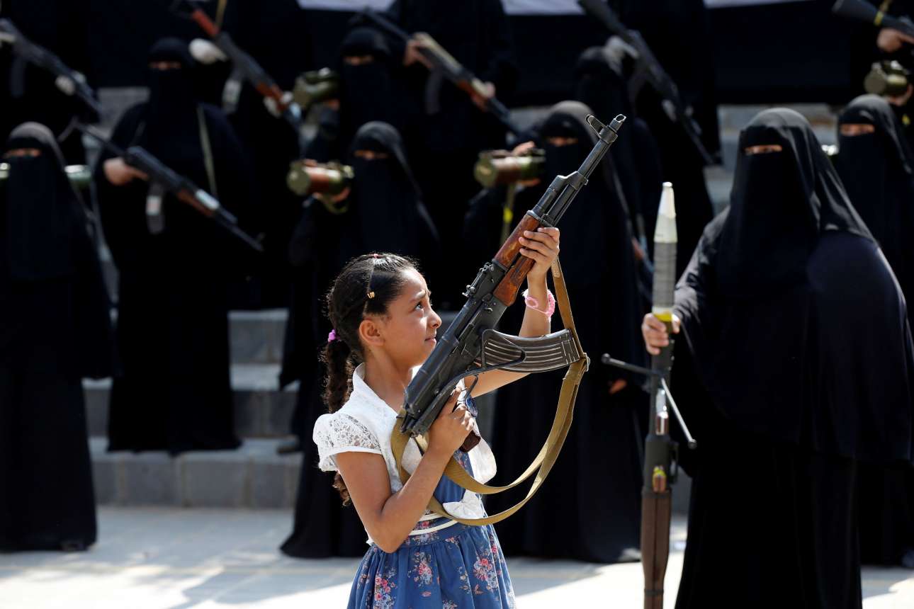 Σαναά, Υεμένη, 6 Σεπτεμβρίου. Γυναίκες στα όπλα. Ενα κορίτσι και δεκάδες γυναίκες κρυμμένες πίσω από νικάμπ παίρνουν μέρος σε διαδήλωση για να δείξουν τη στήριξή τους στο κίνημα ανταρτών Χούθι