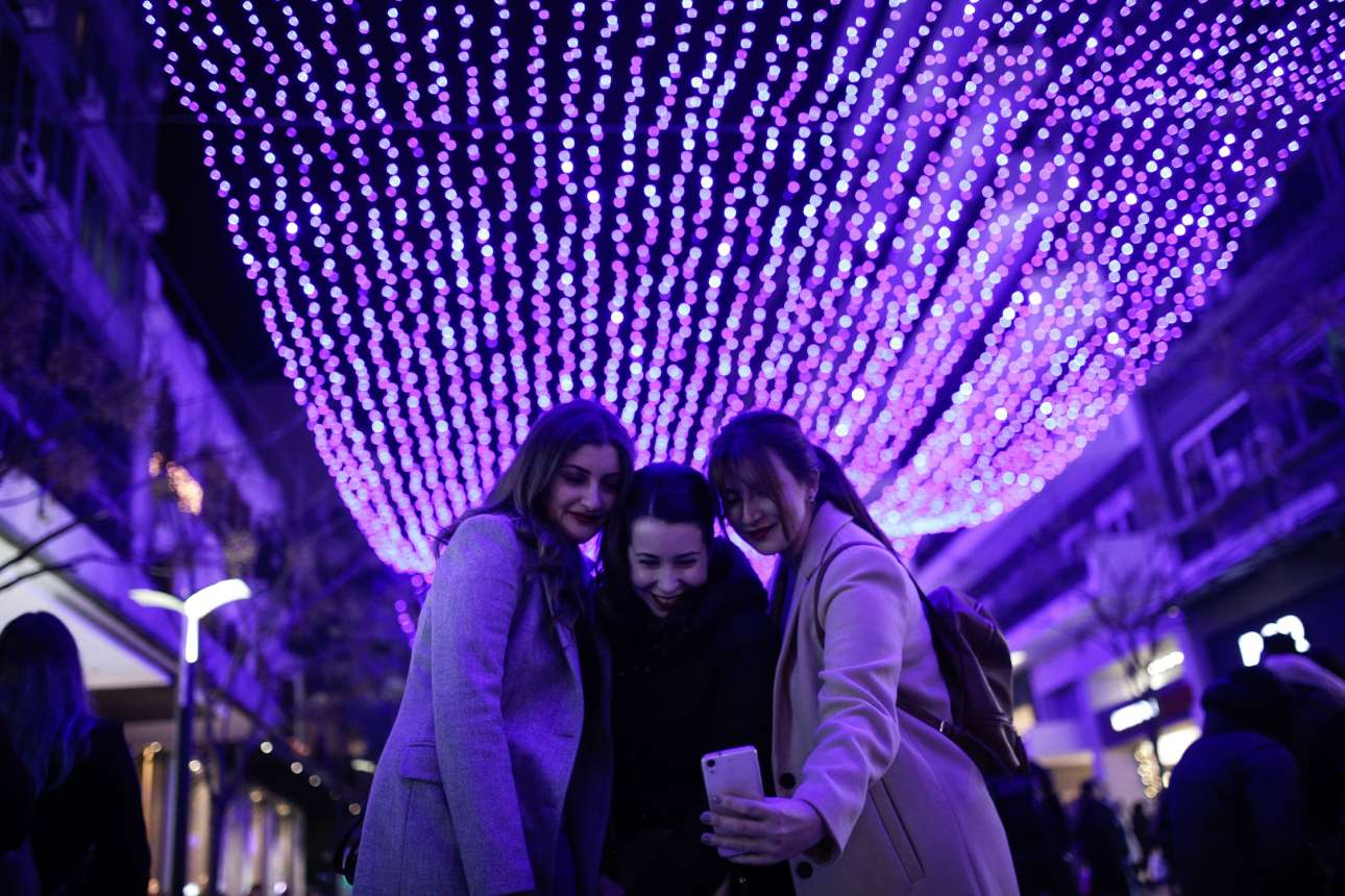 Τρεις φίλες απολαμβάνουν τη γιορτινή φωταγώγηση του πεζόδρομου της Αγίας Σοφίας στη Θεσσαλονίκη