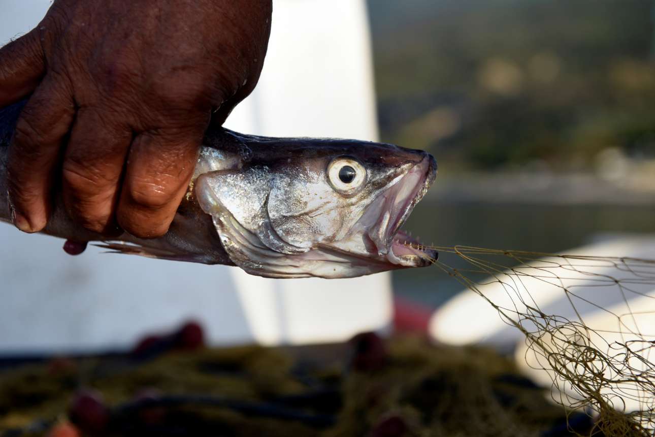 Ο 67χρονος Δημήτρης Καραπέτσας ψαρεύει πάνω στο καΐκι με το όνομα «Κατερίνα», στην ακτή της Ασπροβάλτας
