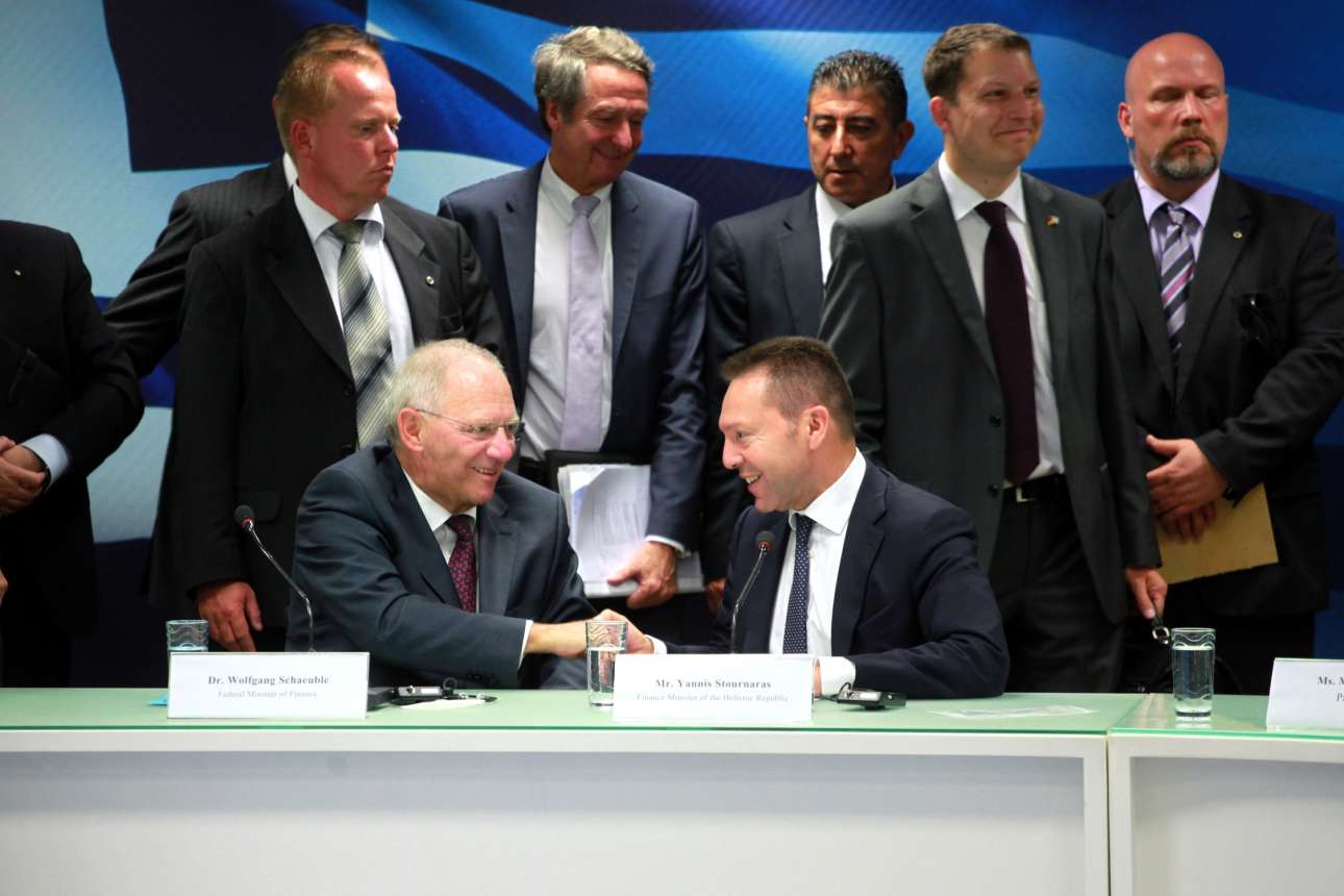 Ιούλιος 2013. Ο Βόλφγκανγκ Σόιμπλε και ο Γιάννης Στουρνάρας σε κοινή συνέντευξη Τύπου στο υπουργείο Οικονομικών στο Σύνταγμα