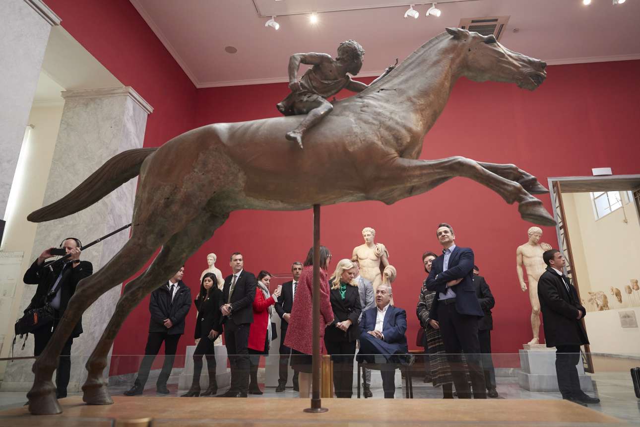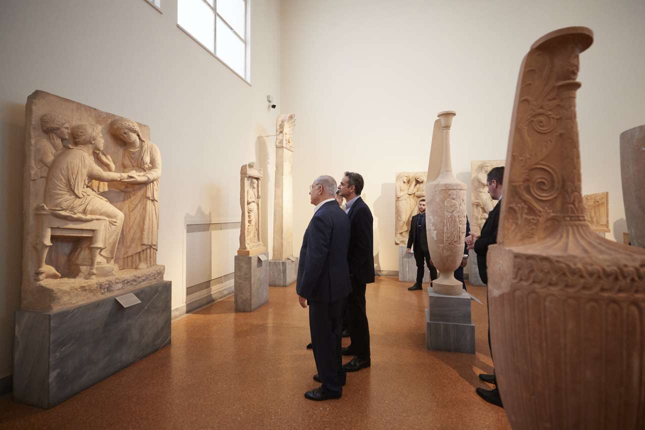 Συνοδευόμενος από τον Κυριάκο Μητσοτάκη και την υπουργό Πολιτισμού Λίνα Μενδώνη –και λίγο προτού αναχωρήσει εσπευσμένα για το Ισραήλ λόγω των δραματικών εξελίξεων στη Μέση Ανατολή με τη δολοφονία στη Βαγδάτη του Κασέμ Σουλεϊμανί– ο Μπενιαμίν Νετανιάχου είχε την ευκαιρία να θαυμάσει τους θησαυρούς του Εθνικού Αρχαιολογικού Μουσείου. Τους πολιτικούς ξενάγησε στα εκθέματα η διευθύντρια του Μουσείου Μαρία Λαγογιάννη. Στο πλευρό του κ. Μητσοτάκη βρισκόταν ο γιος του Κωνσταντίνος, ενώ ο ισραηλινός πρωθυπουργός συνοδευόταν από την σύζυγό του, Σαρα, και τον γιο του Αβνέρ.