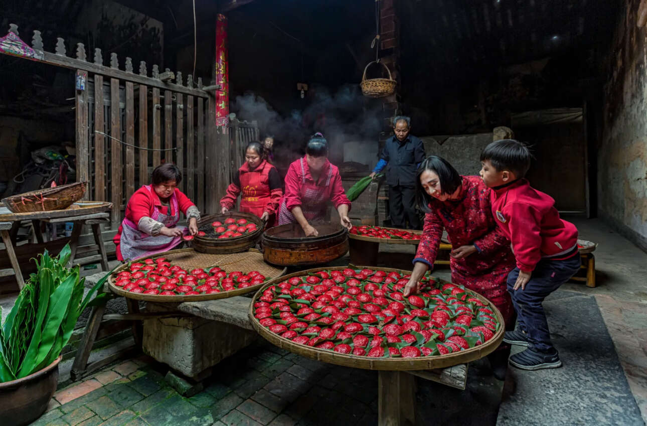 Σε μια μικρή αγροικία στην επαρχία Fujian της Κίνας, μια οικογένεια συγκεντρώνεται για να φτιάξει ντάμπλινγκς με ρύζι και φασόλι. Χρησιμοποιούν μια ξύλινη σφραγίδα για να γράψουν τη λέξη «τύχη» ή «ευτυχία» πάνω στην κόκκινη ζύμη και ατμίζουν τα ντάμπλινγκς μέσα σε ένα μεγάλο σκεύος. Αυτό το έθιμο σημαίνει πως η νέα χρονιά θα τους βρει ενωμένους και θα φέρει αφθονία