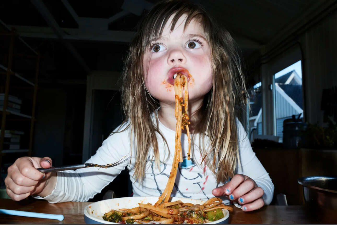 «Ως ενήλικες τρώμε συχνά με τα μάτια και όχι με το στομάχι μας. Τα παιδιά είναι ακόμα πολύ συνδεδεμένα με το στομάχι τους». Ο φωτογράφος απαθανατίζει, για το βιβλίο μαγειρικής της συζύγου του, το παιδί του που τρώει με λαχτάρα μία μακαρονάδα