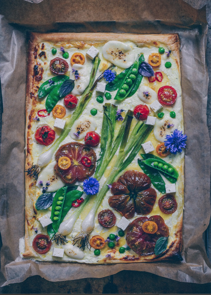 Γιορτάζοντας το καλοκαίρι με μία εντυπωσιακή τάρτα λαχανικών με βουβαλίσια μοτσαρέλα, φέτα, ντοματίνια, μπιζέλια, φρέσκα κρεμμυδάκια και κενταύριο σε μία εικόνα που θυμίζει πίνακα ζωγραφικής