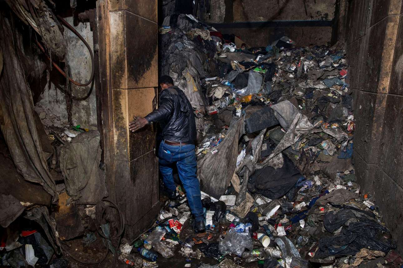 «Ζωή σε ομηρία». Η σειρά φωτογραφιών του Τζόναθαν Τρογκόβνικ εξετάζει τις δυσκολίες που συναντούν οι αφρικανοί μετανάστες φτάνοντας στη Νότιο Αφρική. Στη φωτογραφία μόλις διακρίνεται η είσοδος σε ένα από τα διαλυμένα κτίρια που στεγάζουν αφρικανούς μετανάστες στο Γιοχάνεσμπουργκ. Το κτίριο έχει υποστεί πυρκαγιές, δεν έχει νερό και ρεύμα και η μοναδική είσοδος είναι γεμάτη από σκουπίδια που έχουν συσωρευτεί με τα χρόνια