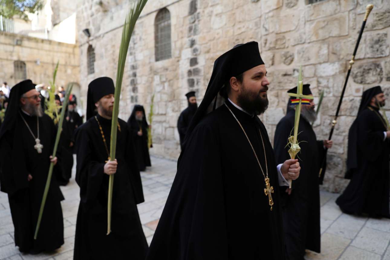 Ιερείς της Ορθόδοξης Εκκλησίας παίρνουν μέρος στην τελετή για την Κυριακή των Βαΐων, κοντά στην Εκκλησία του Παναγίου Τάφου στην Παλιά Πόλη της Ιερουσαλήμ