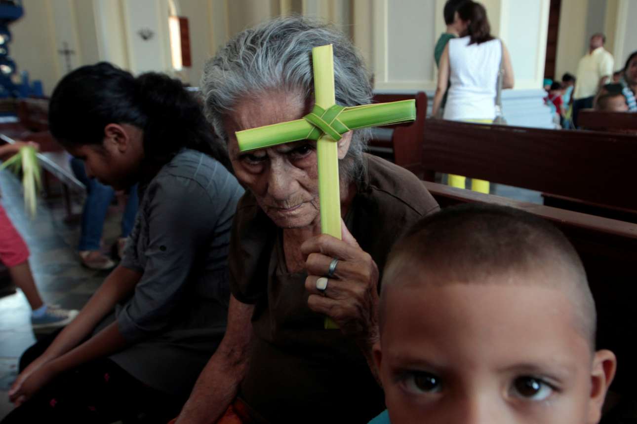 Μια ηλικιωμένη καθολική χριστιανή κρατάει ένα σταυρό φτιαγμένο από φύλλα φοινίκων στην κυριακάτικη λειτουργία των Βαΐων, στην πόλη Γρανάδα της Νικαράγουας