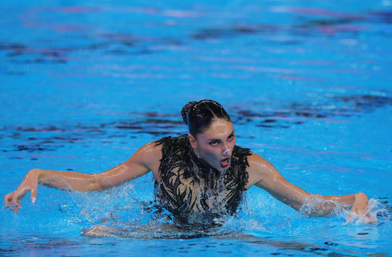 H Ευαγγελία Πλατανιώτη κατέκτησε για λογαριασμό της Ελλάδας το πρώτο χρυσό μετάλλιο Παγκοσμίου Πρωταθλήματος στο απαιτητικό σπορ της καλλιτεχνικής κολύμβησης – η φωτογραφία είναι από την προσπάθειά της στον τελικό