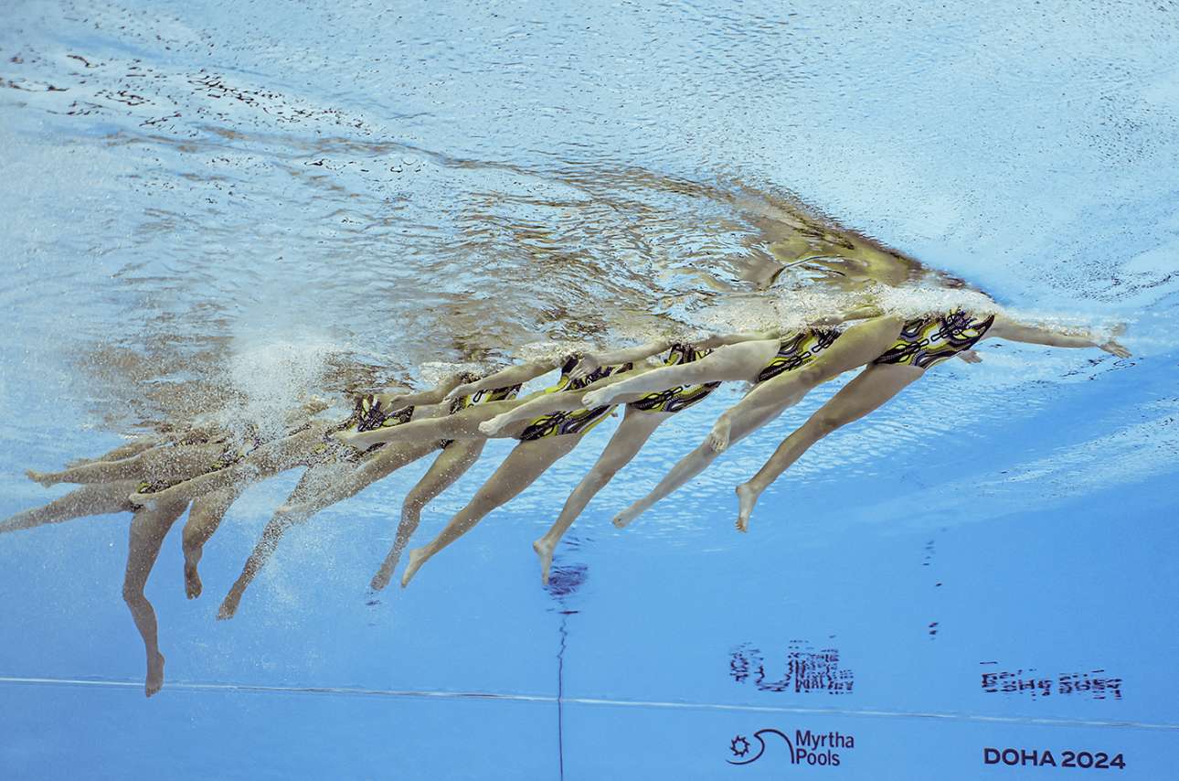 Η ελληνική ομάδα καλλιτεχνικής κολύμβησης εν δράσει, σε καρέ από τον προκριματικό γύρο – το συγκεκριμένο σπορ απαιτεί τόσο αθλητικές όσο και εκφραστικές-καλλιτεχνικές ικανότητες