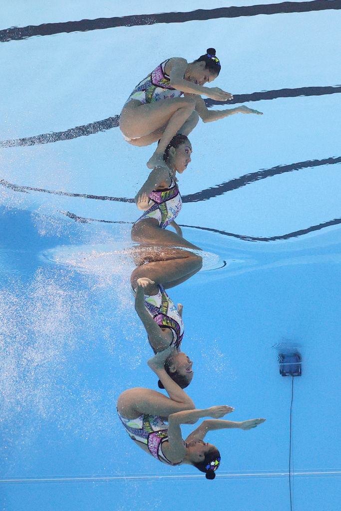Η κινεζική ομάδα καλλιτεχνικής κολύμβησης συνελήφθη από τον φακό σε κυκλική διάταξη, σφιχταγκαλιασμένη και ενωμένη χέρι με χέρι – δυναμική «χορογραφία» που υμνεί το «εμείς»