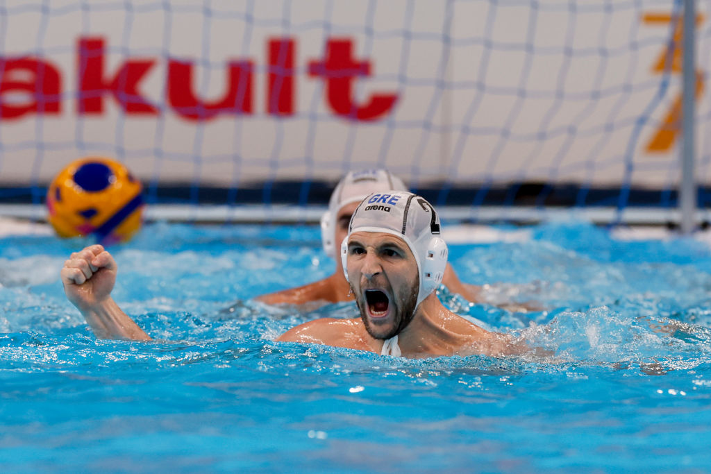 Ο πολίστας του Ολυμπιακού και της Εθνικής Ελλάδος Κωνσταντίνος Γενηδουνιάς πανηγυρίζει ένα γκολ στο ματς με την Ιταλία – στο τέλος χάσαμε με σκορ 11-10