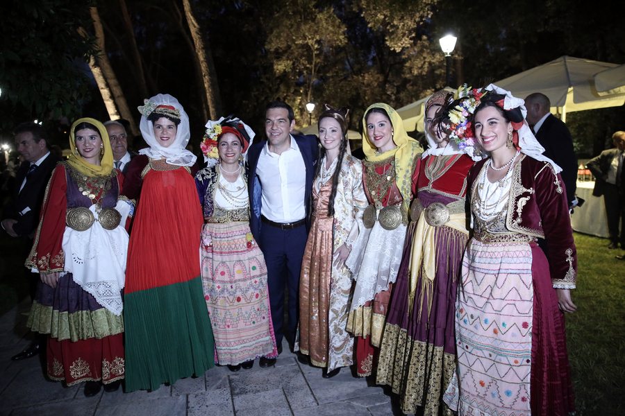 Μια αναμνηστική πόζα με τον Πρωθυπουργό ανάμεσα σε κοπέλες με παραδοσιακές φορεσιές