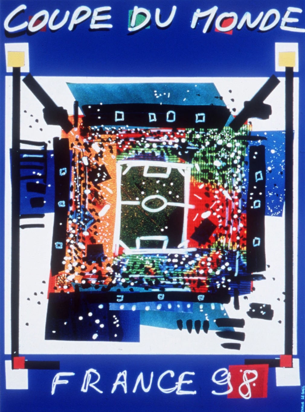 Γαλλία 1998. Το πόστερ που θυμίζει πρόχειρο σχέδιο παιδιού που όμως φέρνει σε πρώτο πλάνο αυτό που πρέπει: το γήπεδο