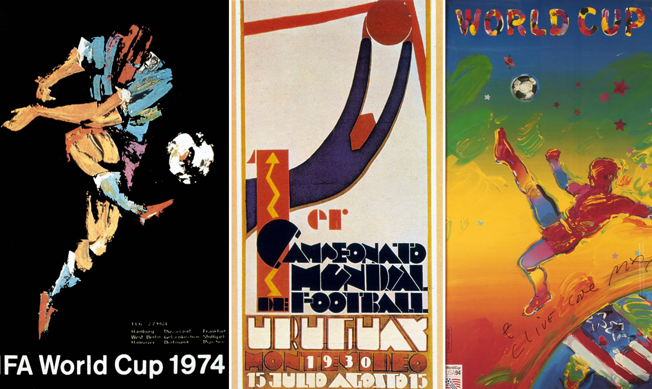 Τρία από τα πόστερ των Παγκοσμίων Κυπέλλων. Αριστερά αυτό του 1974 στη Γερμανία, στο κέντρο το πρώτο του 1930 στην Ουρουγουάη και δεξιά αυτό του 1994 στις ΗΠΑ