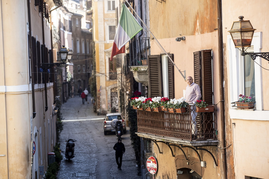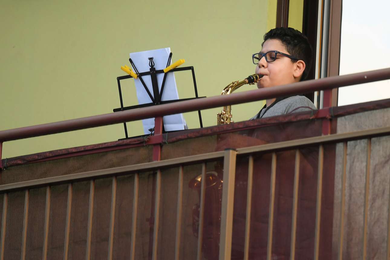 Ενα νεαρό αγόρι παίζει σαξόφωνο στο μπαλκόνι του στην Ρώμη για να εμψυχώσει τους συμπατριώτες του