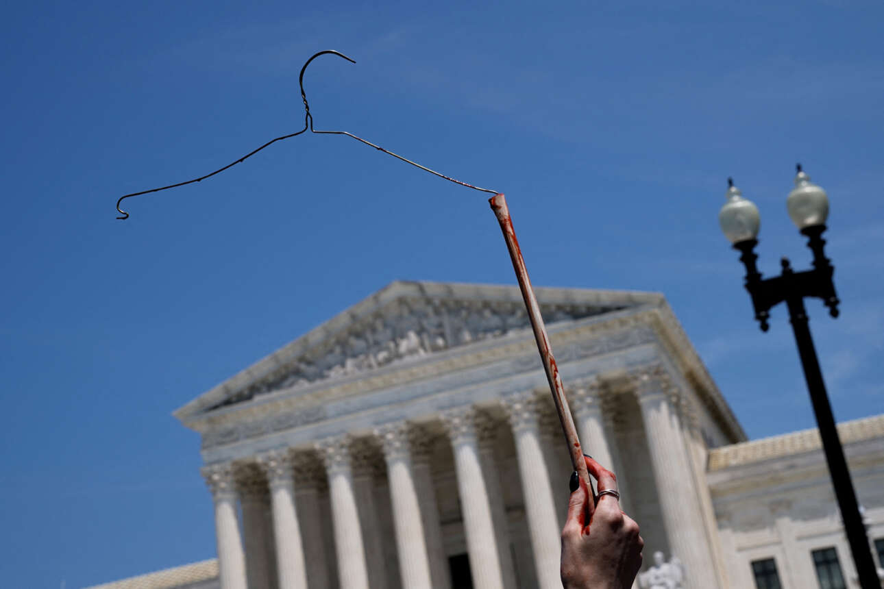 Διαδηλώτρια με χέρια βαμμένα κόκκινα κραδαίνει μια κρεμάστρα έξω από το Ανώτατο Δικαστήριο. Η κρεμάστρα έχει γίνει σύμβολο των επικίνδυνων εκτρώσεων που πραγματοποιούνται σπίτι χρησιμοποιώντας αιχμηρά αντικείμενα
