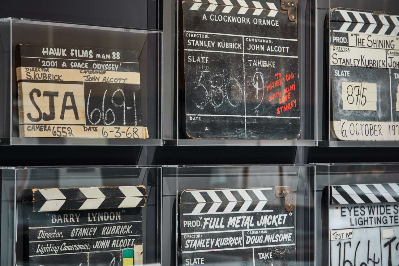 Οι κλακέτες του Κιούμπρικ από τις πιο γνωστές του ταινίες. Η κλακέτα από «Το Κουρδιστό Πορτοκάλι» (κέντρο, επάνω σειρά) έχει και αφιέρωση του σπουδαίου σκηνοθέτη στους γονείς του