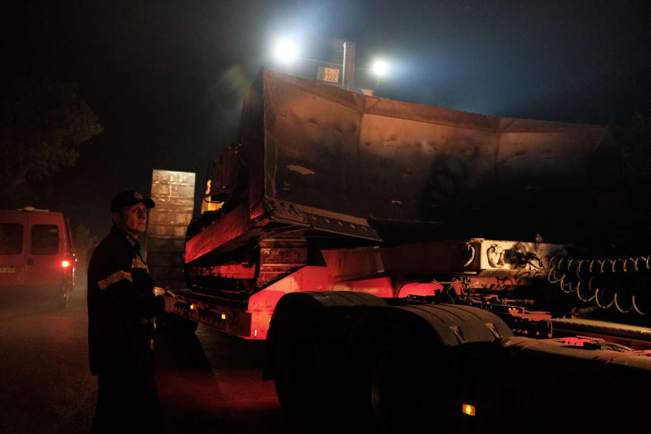 Ανδρας της Πυροσβεστικής μπροστά σε ένα βαρύ όχημα που μεταφέρει εκσκαφείς. Η μάχη τη νύχτα δόθηκε για τη δημιουργία αντιπυρικών ζωνών