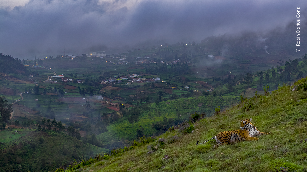 Τίγρης στην πόλη. Νικητής στην κατηγορία Αστική Αγρια Ζωή. Ο Ρόμπιν Ντάριους Κοντς παρακολούθησε μια τίγρη στην πλαγιά ενός λόφου όπου κάποτε υπήρχαν δάση, με φόντο μια πόλη, για μια σειρά ντοκιμαντέρ για την άγρια ζωή της οροσειράς των Δυτικών Γκατ στην Ινδία. Εκείνη την ημέρα χρησιμοποίησε ένα drone για να παρακολουθήσει την τίγρη να εξερευνά την επικράτειά της πριν εγκατασταθεί σε εκείνο το σημείο