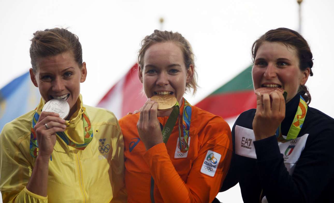 Οι τρεις νικήτριες της ποδηλασίας δρόμου, η Εμα Γιόχανσον από τη Σουηδία, η Αννα Βαν ντερ Μπρέγκεν από την Ολλανδία και η Ελίζα Λόνγκο Μποργκίνι από την Ιταλία, πάνω στο βάθρο ποζάρουν δαγκώνοντας τα μετάλλια τους