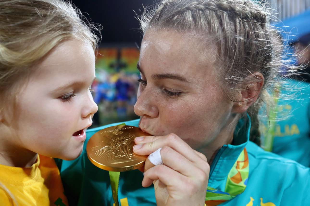 Μία τρυφερή στιγμή ανάμεσα στην Νικόλ Μπεκ, χρυσή ολυμπιονίκη στο ράγκμπι με την ομάδα της Αυστραλίας, και την κόρη της