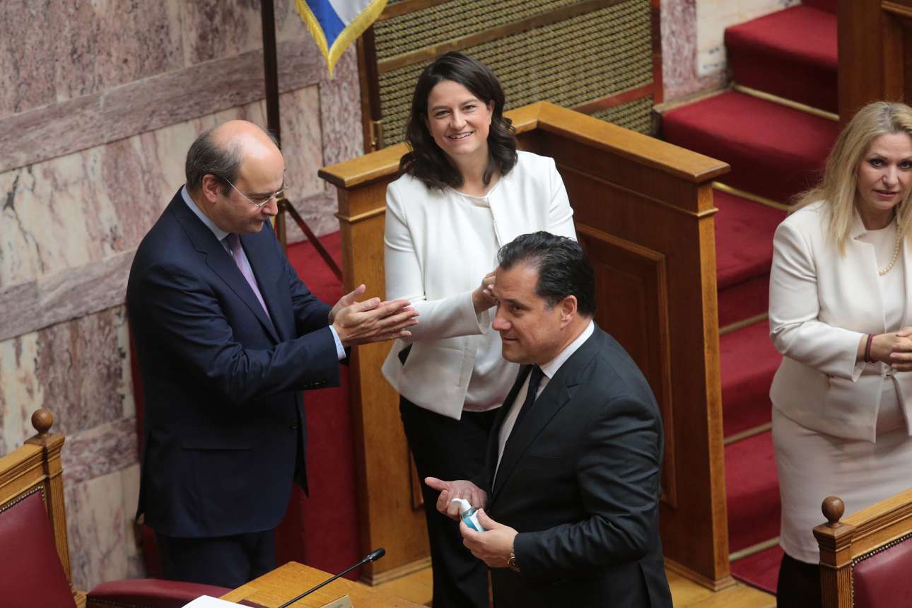 Αδωνις Γεωργιάδης, Κωστής Χατζηδάκης και Νίκη Κεραμέως καθαρίζουν τα χέρια τους με απολυμαντικό