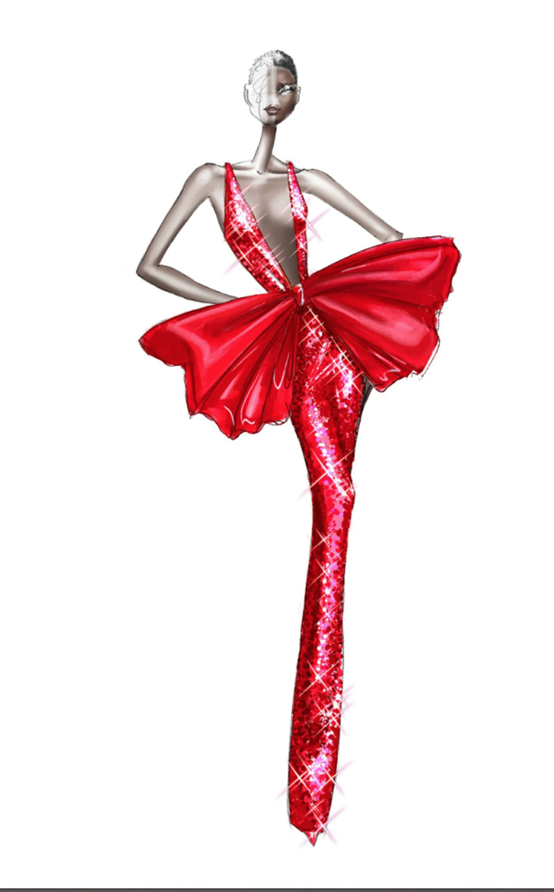 Κόκκινη ολόσωμη φόρμα με παγιέτες και ένας τεράστιος φιόγκος στη μέση: ένα εντυπωσιακό κομμάτι από τον οίκο Ralph & Russo με έντονες αναφορές στη Τζέσικα Ράμπιτ και στις δημιουργίες του Yves Saint Laurent της δεκαετίας του 80