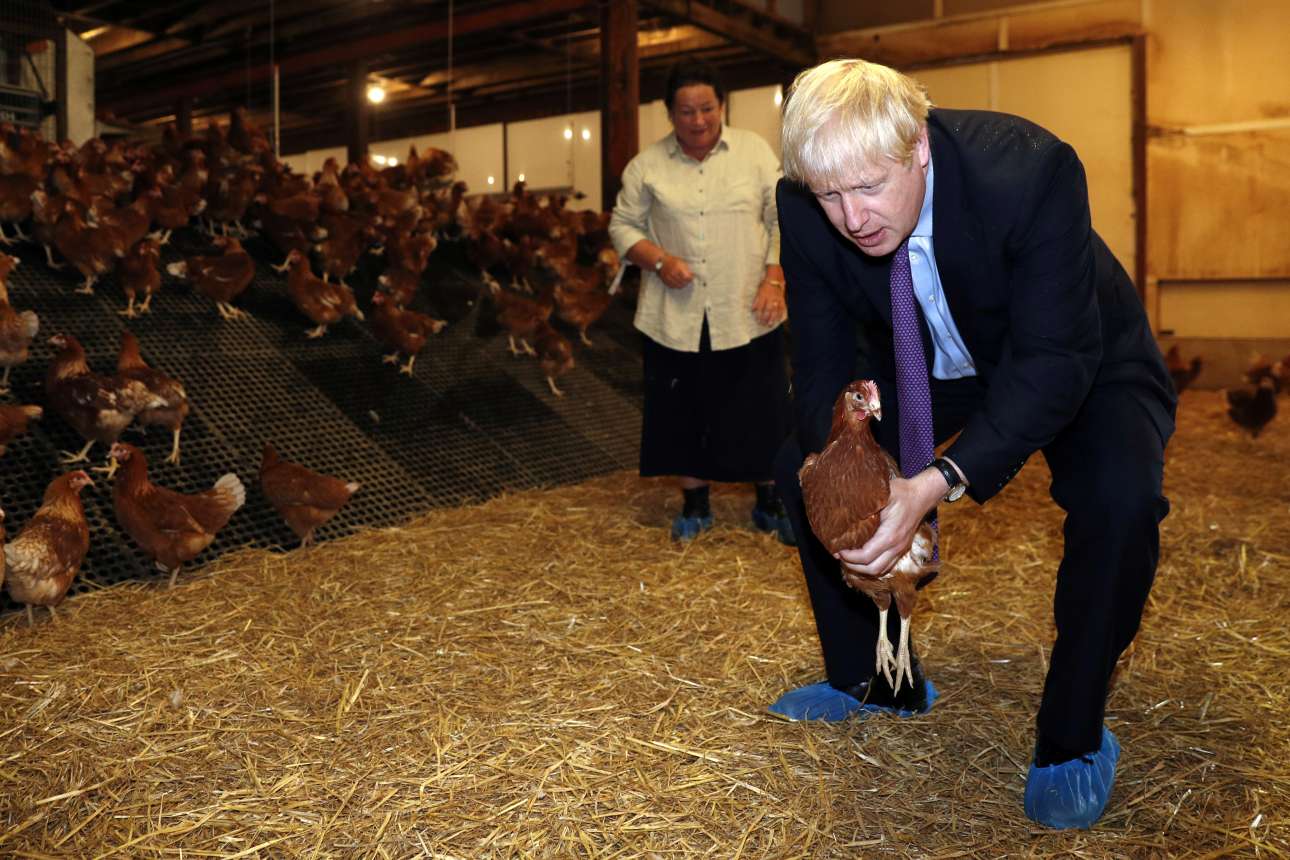 Τρίτη, 30 Ιουλίου 2019. Ο πρωθυπουργός πιάνει μια κότα κατά την επίσκεψή του σε ορνιθοτροφείο στην Ουαλία. Στόχος του να τονίσει τα οφέλη για τη βρετανική κτηνοτροφία από το Brexit