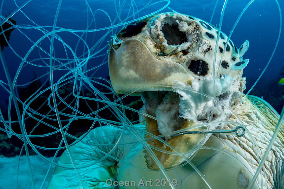 Πρώτη θέση στην κατηγορία Προστασία. Το κουφάρι μιας θαλάσσιας χελώνας εγκλωβισμένης σε πλαστικά δίχτυα, στις Μπαχάμες. Ο φωτογράφος Σέιν Γκρος ήθελε με αυτή την ανατριχιαστική του εικόνα να ευαισθητοποιήσει για το πρόβλημα της πλαστικής ρύπανσης και της αλιείας αυτού του είδους