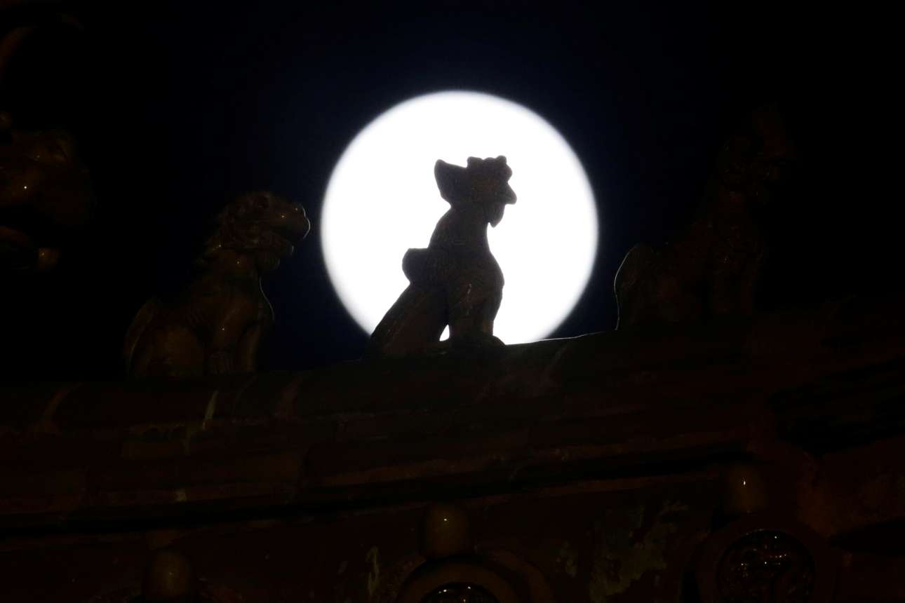Η πανσέληνος βγαίνει πάνω από τον θόλο της βιβλιοθήκης του Πανεπιστημίου της Κύπρου, στη Λευκωσία