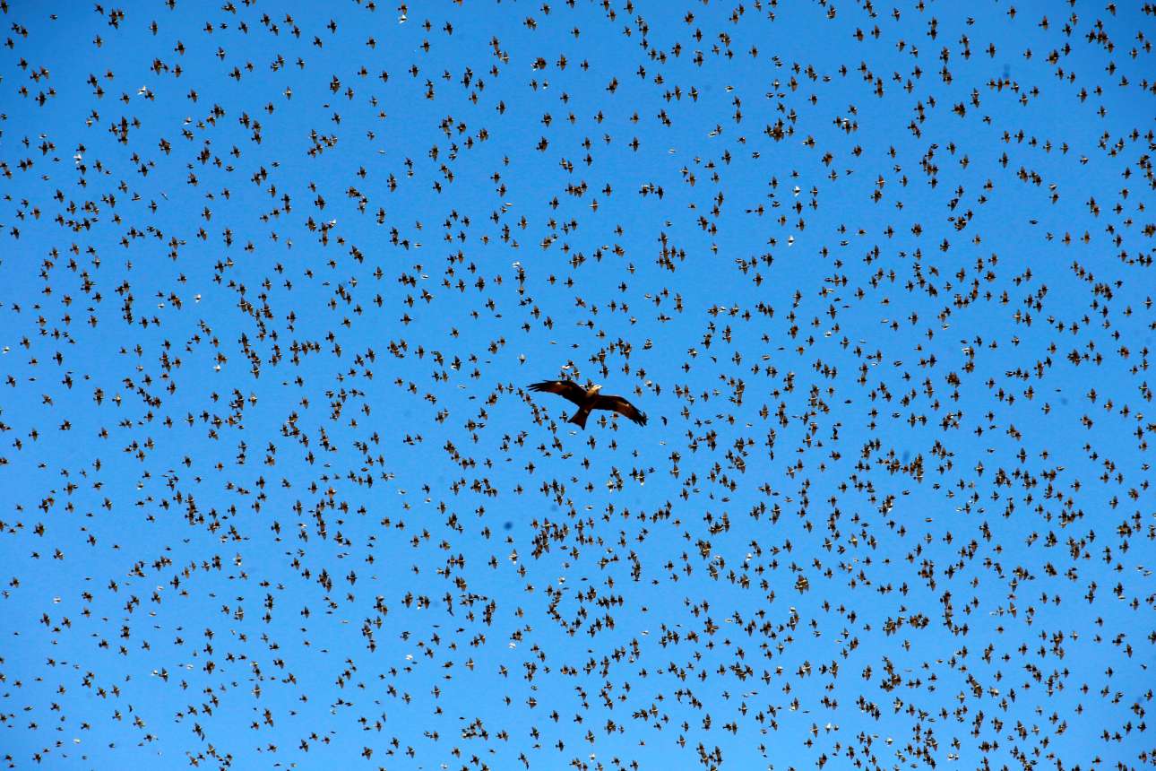 Κάθε χρόνο τέτοια εποχή, χιλιάδες ψαρόνια διασχίζουν την Ευρώπη ψάχνοντας για θερμότερα κλίματα, προσφέροντας παράλληλα ένα από τα πιο εντυπωσιακά φυσικά φαινόμενα. Τα σμήνη πουλιών μεταναστεύουν «ζωγραφίζοντας» πολύπλοκα σχέδια και σχήματα στον ουρανό για να προστατευτούν από θηρευτές και για να βρουν τροφή, ένας μηχανισμός που παραμένει μυστήριο πώς ακριβώς λειτουργεί. Ενα τέτοιο σμήνος απαθανάτισε ο φακός του πρακτορείου Reuters πάνω από το νότιο Ισραήλ