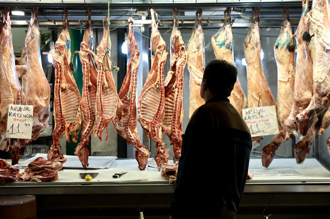 Κλασικό μεγαλοβδομαδιάτικο καρέ της Βαρβακείου με θέμα το άγχος μας μπροστά στα εκθέματα του κρεοπωλείου – υπαινίσσεται ότι και εφέτος το λαϊκό πορτοφόλι οδηγήθηκε στο ταμείο ως πρόβατον επί σφαγήν
