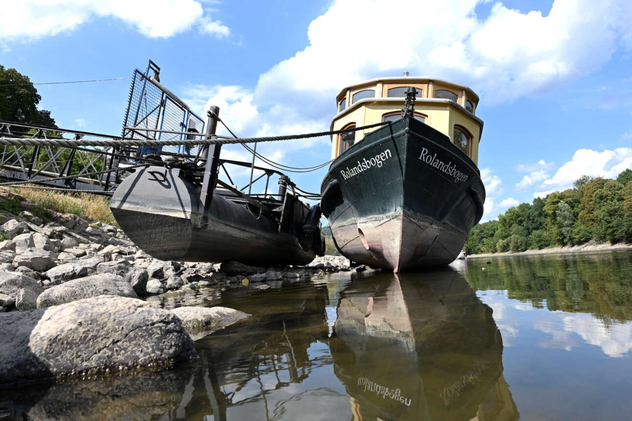 Eνα μεταφορικό πλοίο περνά από την μερικώς αποξηραμένη κοίτη του ποταμού Ρήνου