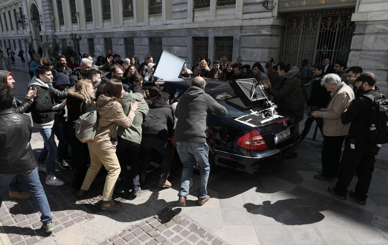 Ο Κώστας Γαβράς ελέγχει τις τελευταίες λεπτομέρειες για τη σκηνή με το πρωθυπουργικό όχημα υπό το βλέμμα περαστικών στην Αιόλου