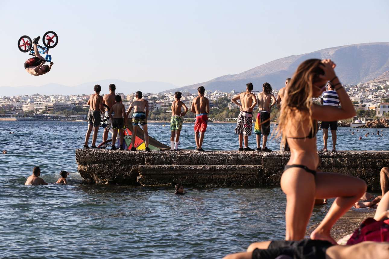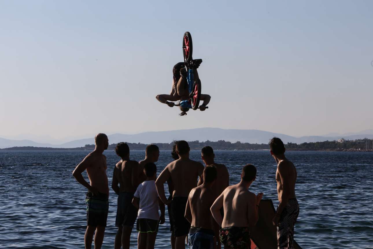 Το περασμένο Σάββατο ο φωτογραφικός φακός του SOOC κατέγραψε ένα σπάνιο δρώμενο στο Καβούρι: εντυπωσιακές φιγούρες παράτολμων νεαρών που χρησιμοποίησαν την ράμπα της παραλίας για να κάνουν βουτιές στην θάλασσα μαζί με τα ποδήλατά τους.