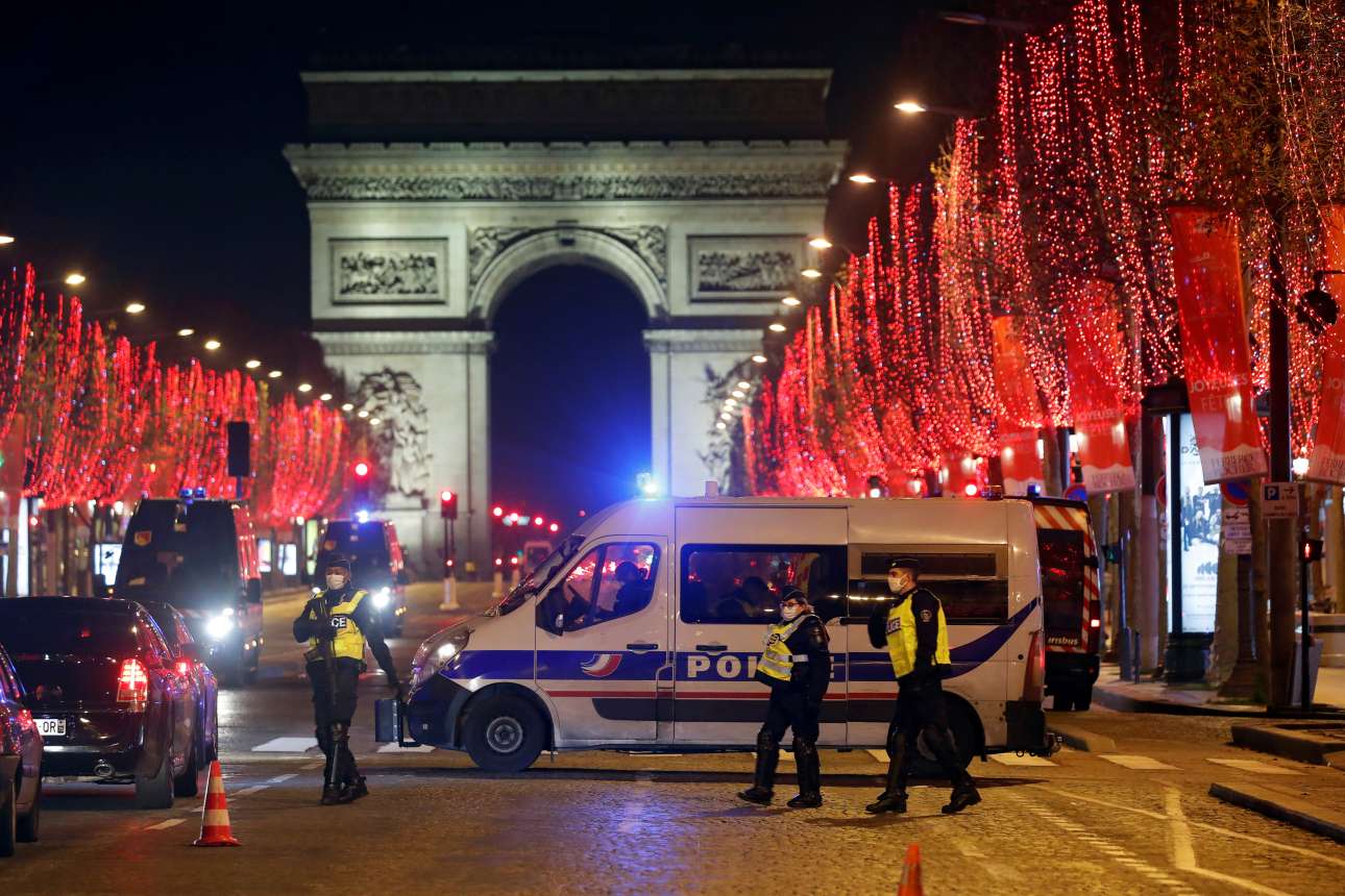 Αστυνομικοί ελέγχουν την κίνηση στη λεωφ. των Ηλυσίων στο Παρίσι. Οι εορτασμοί απαγορεύτηκαν λόγω Covid-19