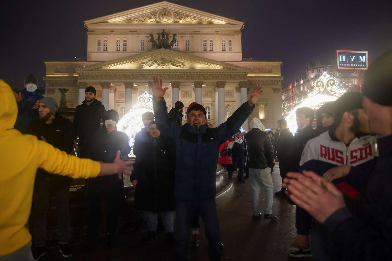 Όμως πολλοί ήταν οι Μοσχοβίτες που αψήφησαν το κρύο και τις συστάσεις των Αρχών και συγκεντρώθηκαν μπροστά από το Θέατρο Μπολσόι για να υποδεχτούν το 2021