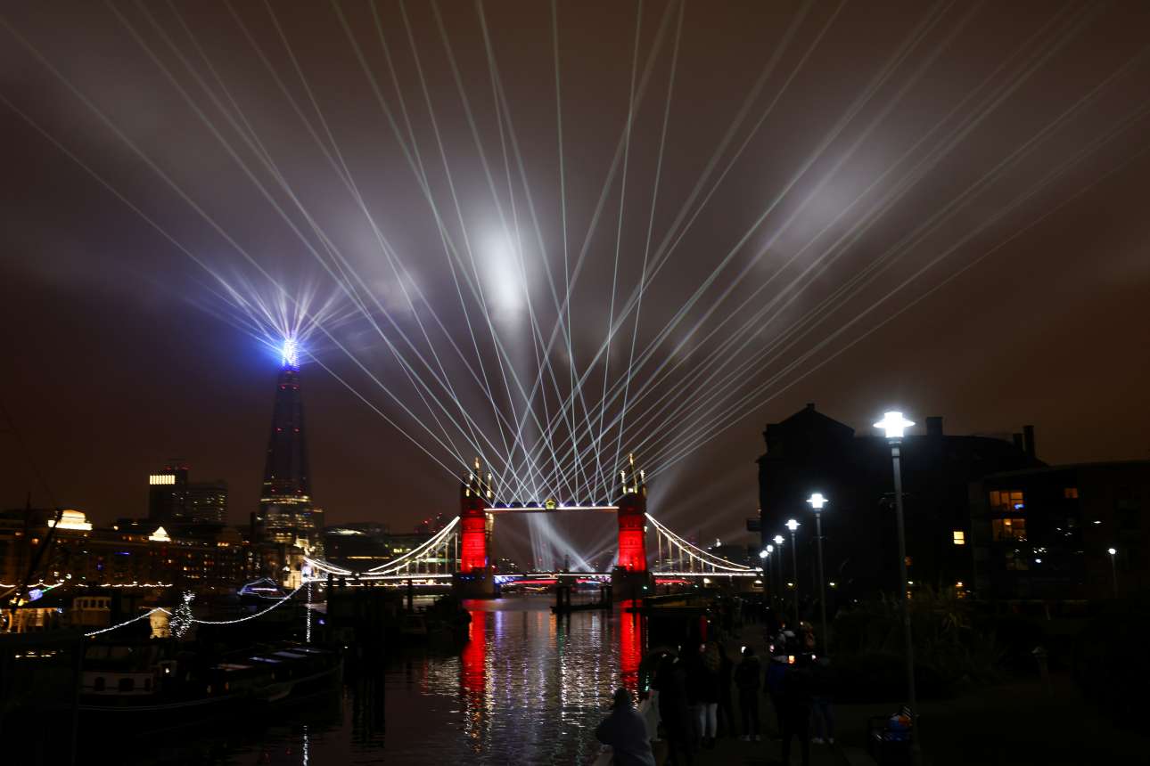 Ένα θέαμα με φώτα πάνω από την Τάουερ Μπριτζ. Η αλλαγή του χρόνου σηματοδότησε και την οριστική έξοδο της Βρετανίας από την ΕΕ