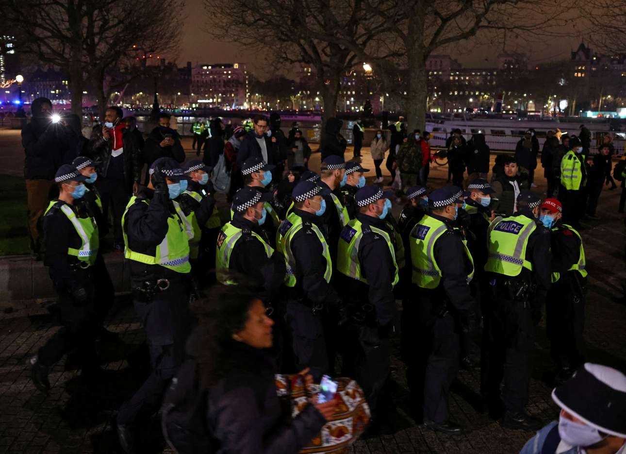 Αστυνομικοί προσπαθούν να επιβάλουν μια κάποια τάξη. Η Βρετανία βιώνει ένα σφοδρό δεύτερο κύμα της πανδημίας, αλλά ο κόσμος βγήκε στους δρόμους για την Πρωτοχρονιά