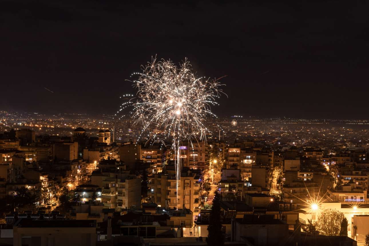 Πυροτεχνήματα σκεπάζουν τον νυχτερινό ουρανό πάνω από την Ακρόπολη τα μεσάνυχτα